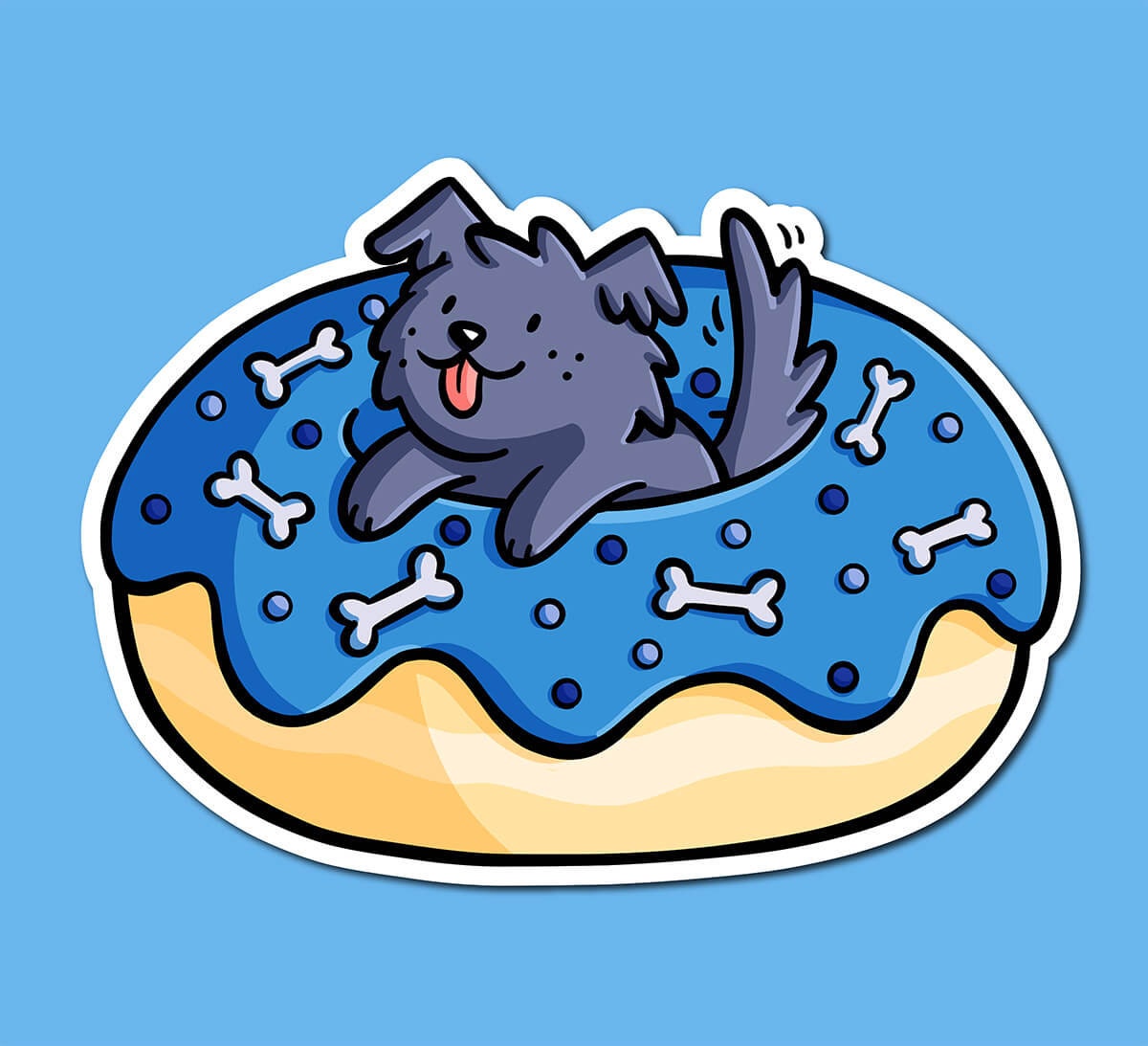 This die-cut sticker is strong enough to last on a car, water bottle, bike, helmet or anything you'd like to customize! Sticker features my original vector illustration of a super cute dog chillin’ in a donut!